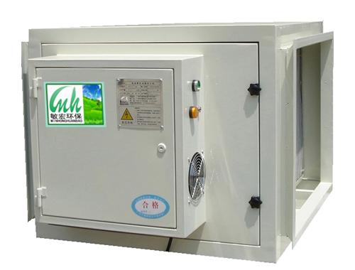 靜電復(fù)合油煙凈化器應(yīng)用靜電沉積和機(jī)械過濾工作原理對油煙氣體進(jìn)行凈化處理,廚房含油煙混合氣體經(jīng)收集進(jìn)入油煙凈化器,其中大顆粒油滴和一些雜質(zhì)被前置均流和過濾裝置打散或阻擋,在高壓電離電場電暈作用下,電場中的空氣被電離,產(chǎn)生大量的負(fù)離子和正離子,因此微小的油煙顆粒經(jīng)過電離電場后成為載荷顆粒,在經(jīng)過吸附電場時在電場力的作用下,載荷顆粒向吸附電場的正、負(fù)極板運(yùn)動過去,經(jīng)極板最后流入并沉積在油煙凈化機(jī)底部的儲油箱內(nèi)。